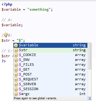 为了不分散的实际字符串编辑,你必须按Ctrl + Space来调用代码完成:
