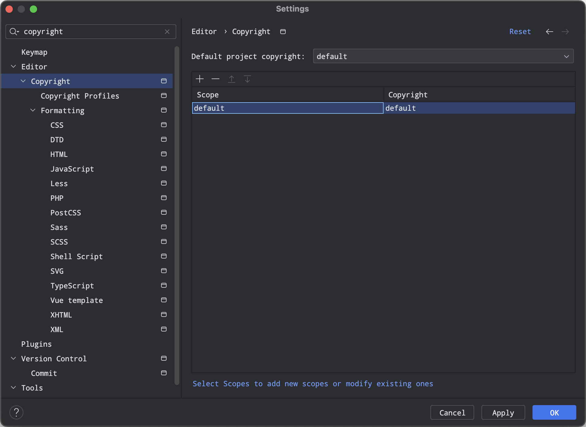 并不是所有的文件都需要同样的版权信息, 我们在需要的目录中添加版权, 这就用到 PHPstorm 的 Scope (范围) 功能.
