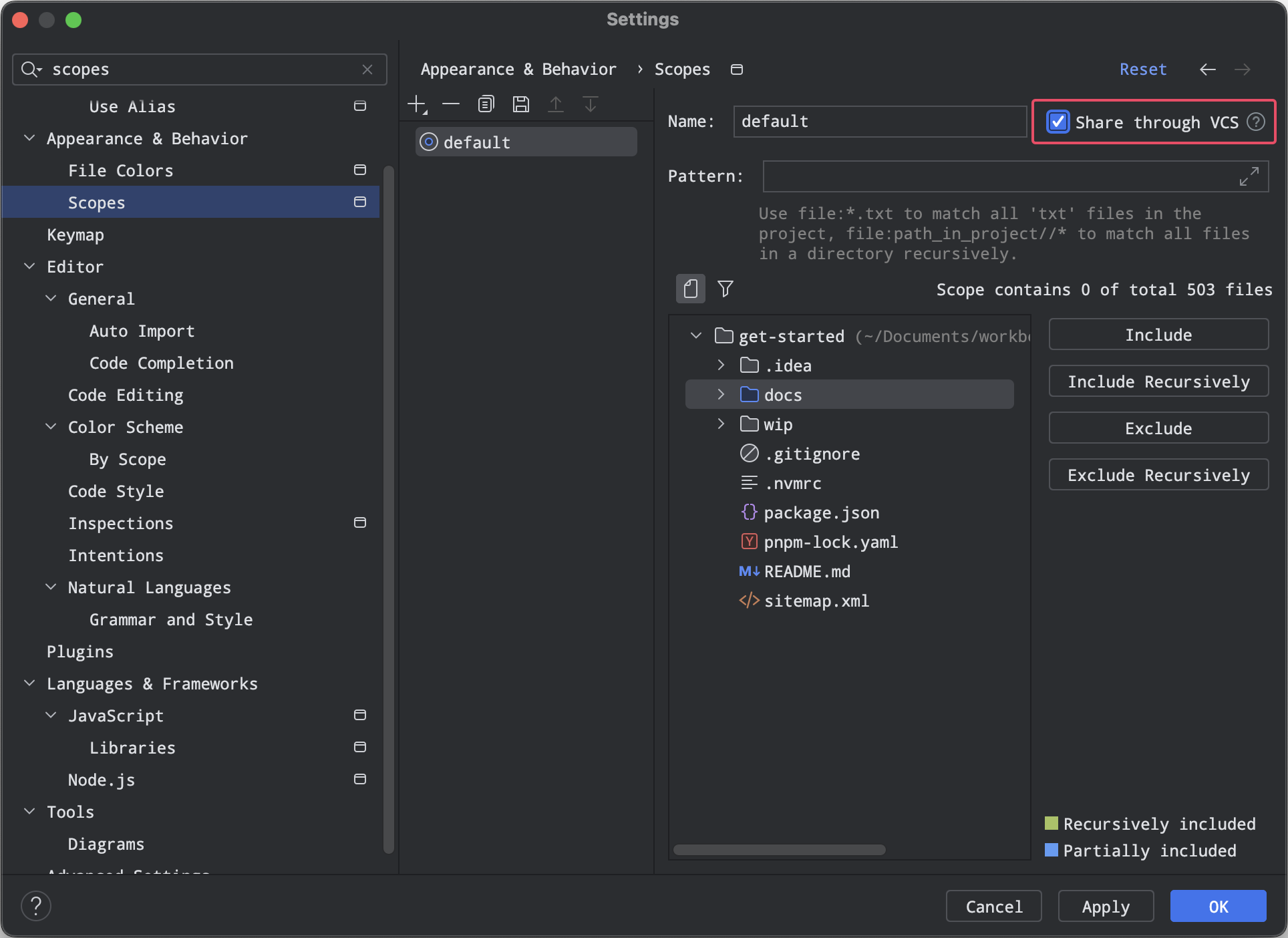 搜索 scope, 找到设置项目, 根据文件夹来进行选择, 排除等设置,最后勾选 Share through VCS