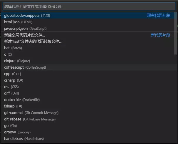 - ② 对应语言的局部代码片段(只能在对应语言环境下才能触发),新建全局代码片段会在
