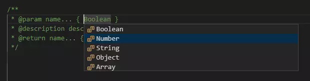 " * @param name... { ${1|Boolean,Number,String,Object,Array|} }",
