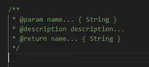 }上面是一个简单的方法注释代码块,占位符默认不带可选项,如果要设置占位内容的可选项,写法为 ${1|a,b,c} ,括号中的 1 对应的是按 TAB 之后的光标落点顺序, abc 为可选的项,用逗号隔开。所以上面的代码在输入 zs + TAB 后第一个光标会落在 param name... {} 的大括号中( $1 的位置),如下图可以看到设置的可选项。