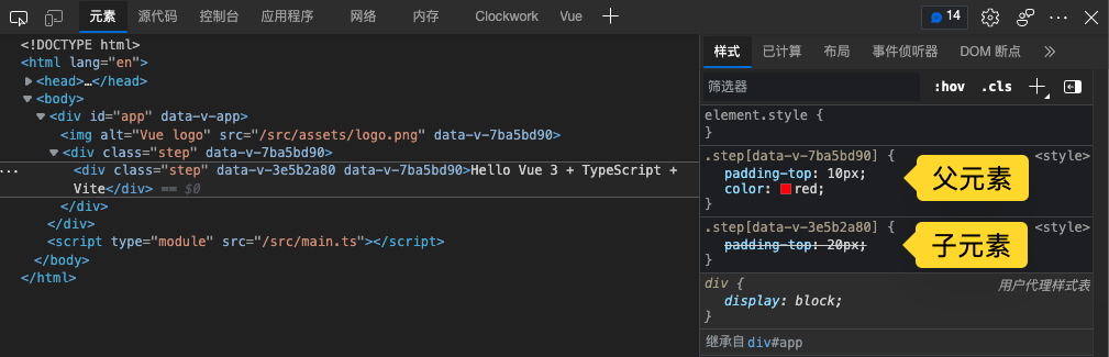 使用 scoped 后,父组件的样式将不会渗透到子组件中。不过一个子组件的根节点会同时受其父组件的 scoped CSS 和子组件的 scoped CSS 的影响。这样设计是为了让父组件可以从布局的角度出发,调整其子组件根元素的样式