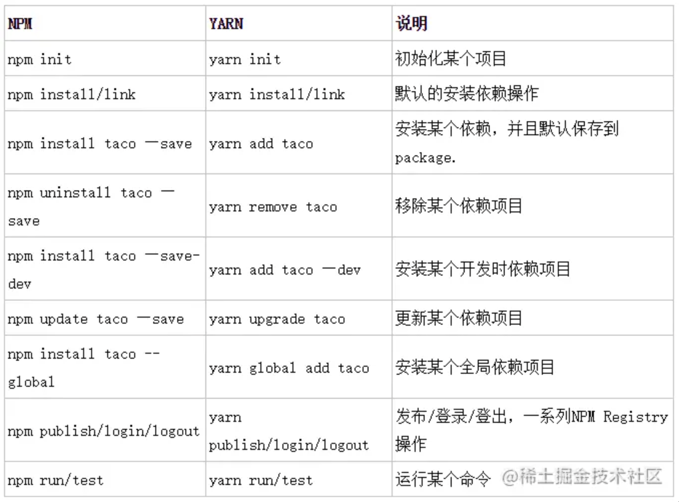 yarn add [package] // 在当前的项目中添加一个依赖包,会自动更新到package.json和yarn.lock文件中