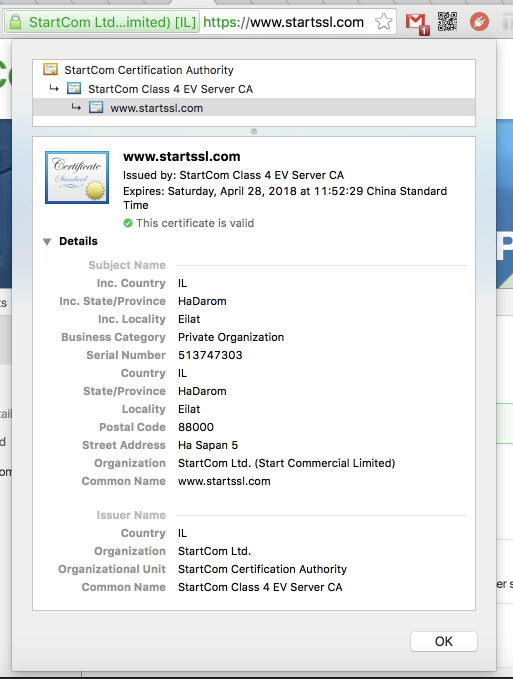 免费的证书安全认证级别一般比较低,不显示单位名称,不能证明网站的真实身份,仅起到加密传输信息的作用,适合个人网站或非电商网站。由于此类只验证域名所有权的低端 SSL 证书已经被国外各种欺诈网站滥用,因此强烈推荐部署验证单位信息并显示单位名称的 OV SSL 证书或申请最高信任级别的、显示绿色地址栏、直接在地址栏显示单位名称的 EV SSL 证书,就好像 StarCom 的地址栏一样:
