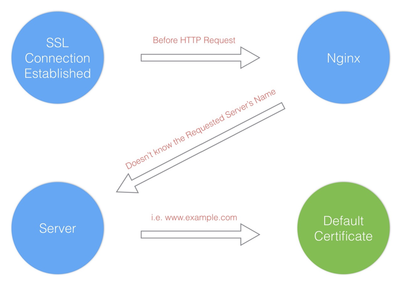 这是因为 SSL 协议行为所致,SSL 连接在浏览器发送 HTTP 请求之前就被建立,Nginx 并不知道被请求的服务器名字,因此 Nginx 只会提供默认的服务器证书。