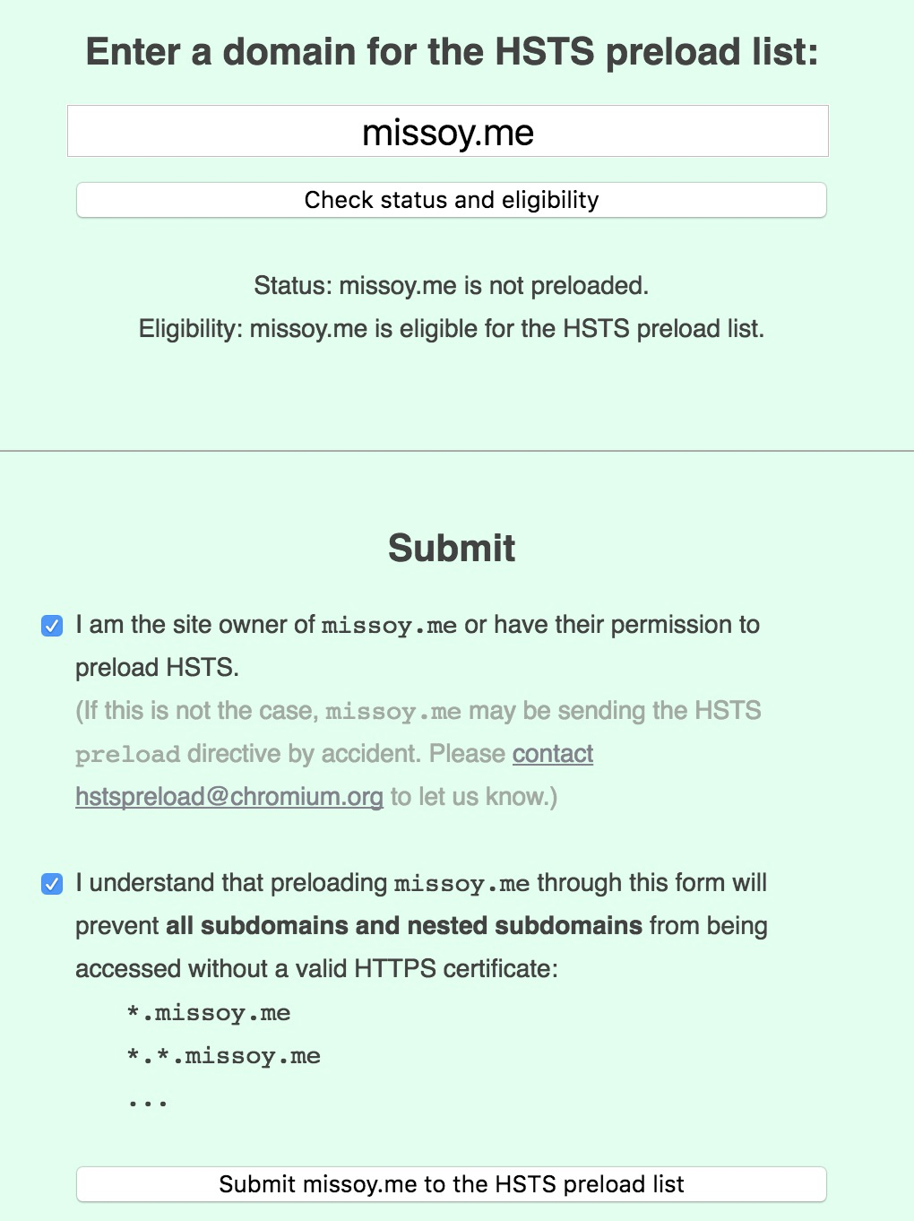 针对这种情況,Google 维护了一份『HSTS 预加载列表』,列表里包含了使用了 HSTS 的站点主域名和子域名,可以通过以下页面申请加入: