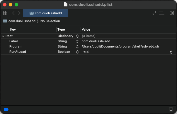 plutil ~/Library/LaunchAgents/com.duoli.sshadd.plist